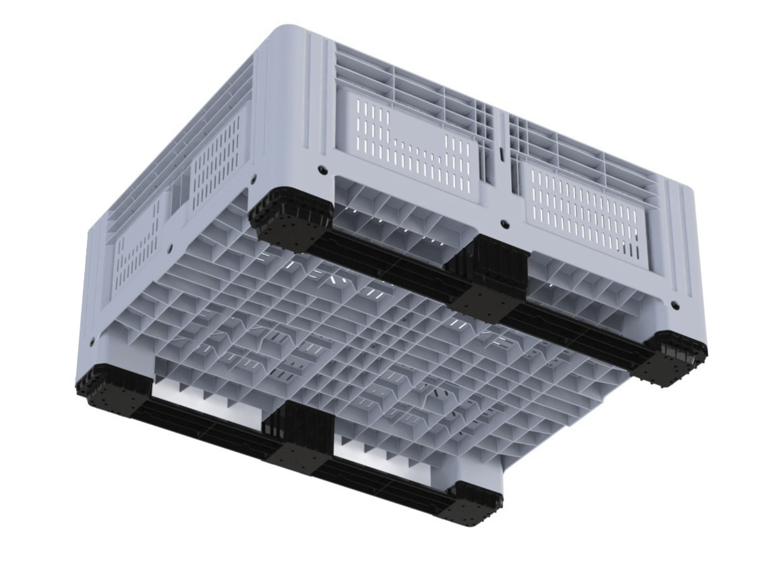 Palot box de plástico 1200x1000x500 mm. Paredes y fondo rejillado, con dos patines para volteo. Fabricado con polietileno, 100% reciclable y 368 litros de capacidad.