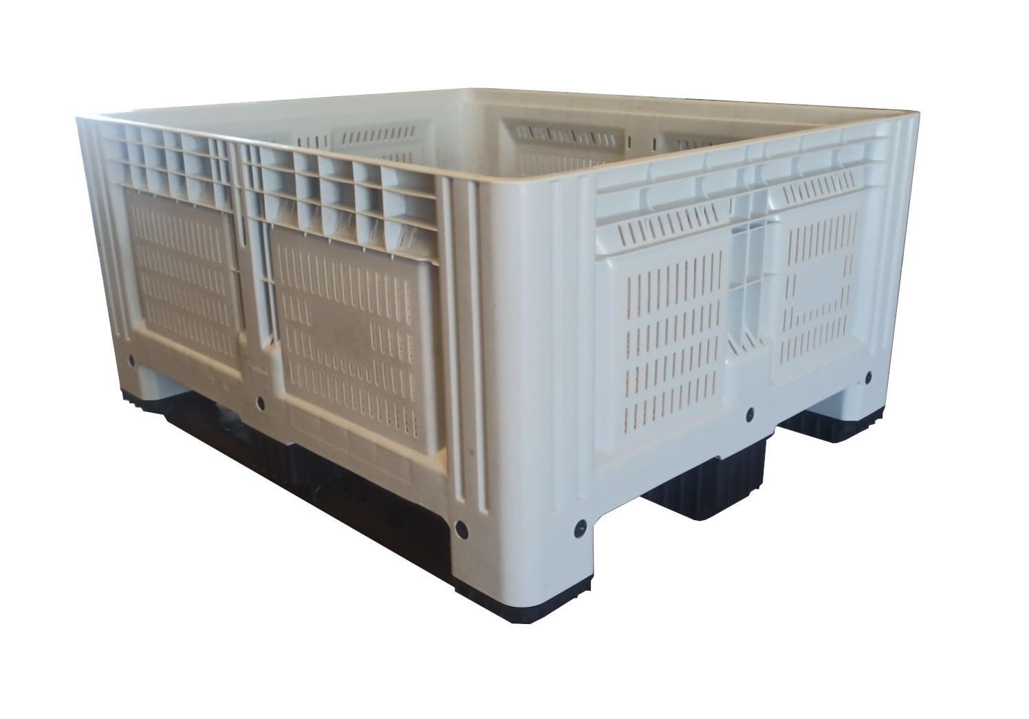 Palot box de plástico 1200x1000x580 mm. Paredes y fondo rejillado con tres patines para volteo. Fabricado con polietileno, capacidad de 456 litros. 100% reciclable.