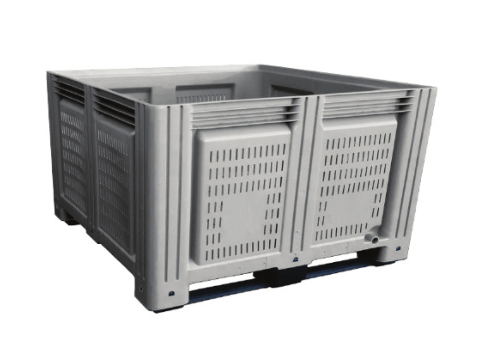 Palot de plástico de medida 1200x1200x760 m. Paredes y fondo rejillado con dos patines para volteo. Fabricado con polietileno, 770 litros de capacidad. 100% reciclable.
