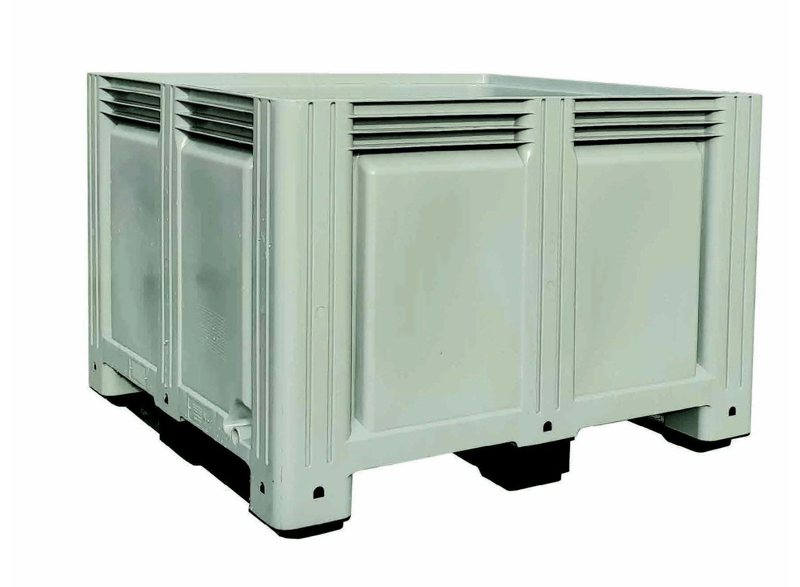 Palot de plástico de 1200x1200x850 mm. Paredes y fondo liso con tres patines para volteo. Gran capacidad de 910 litros. Apilable hasta 10 alturas