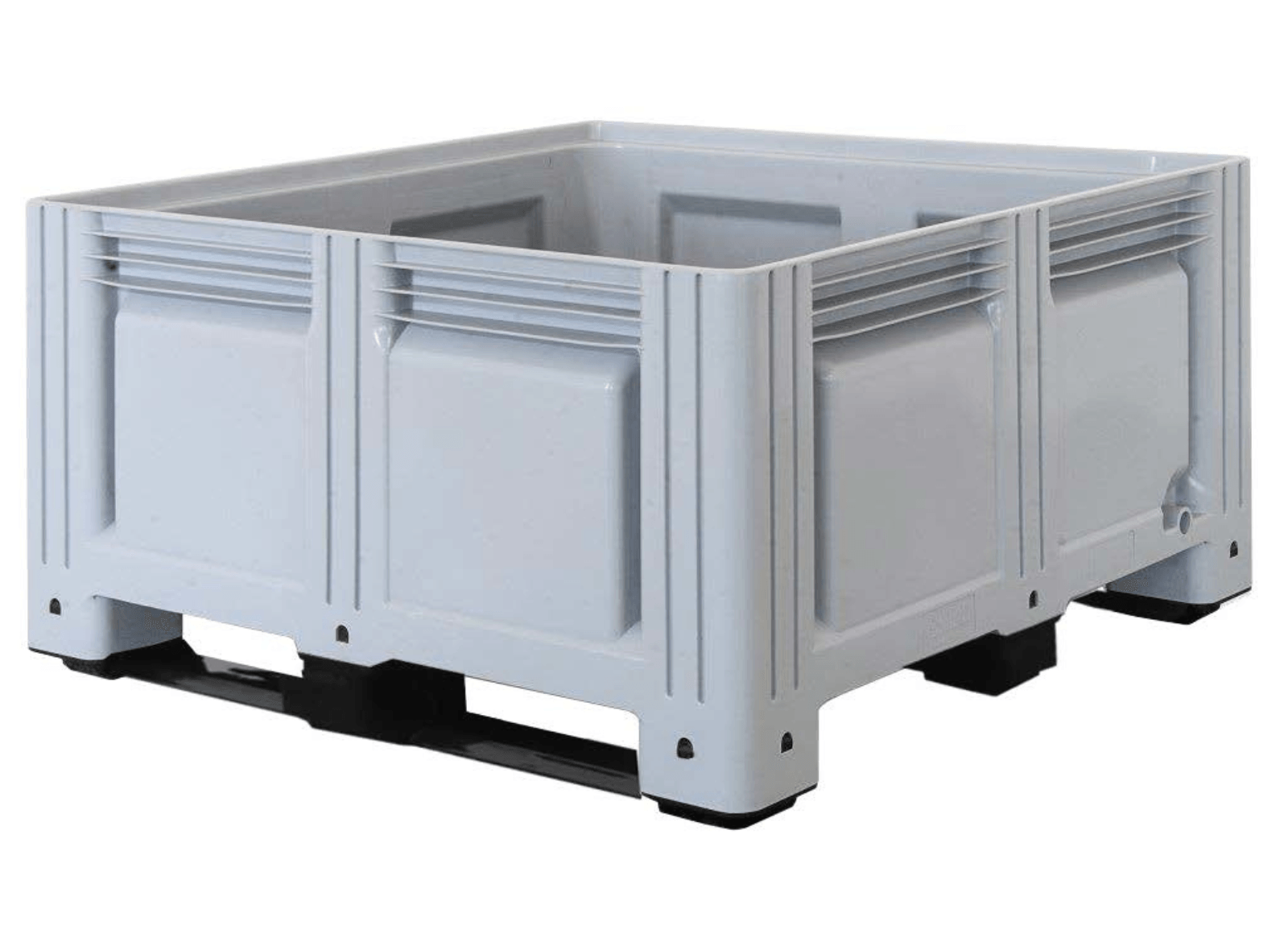 Palot de plástico de 1200x1200x630 mm. Paredes y fondo liso con tres patines para el volteo. Capacidad de 598 litros.