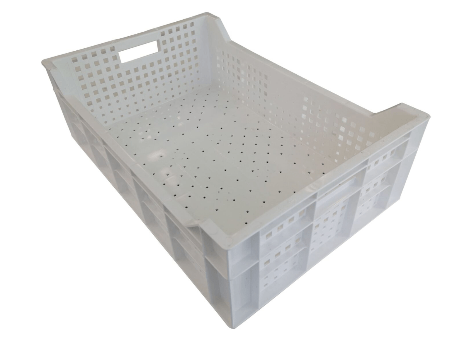 Caja agrícola de plástico, apilable y retornable de 600x400x190 mm. Paredes y fondo perforado de 30 litros de capacidad y 2.000 g. de peso. 100% reciclable.