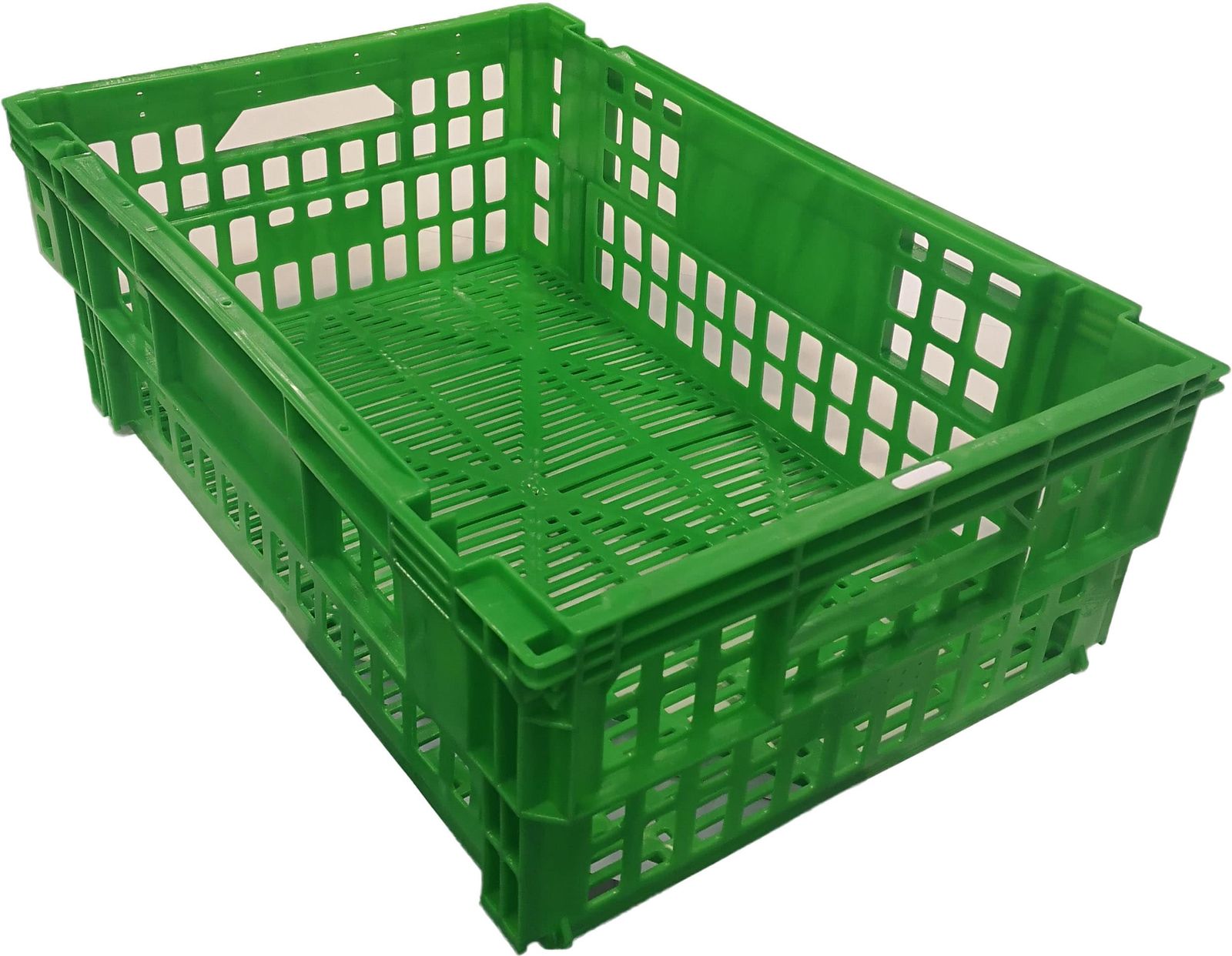Caja de plástico perforada de 600x400x200 mm. Apilable y encajable de 30 litros de capacidad y 1.550 g. de peso. Utilizada en el sector Avícola