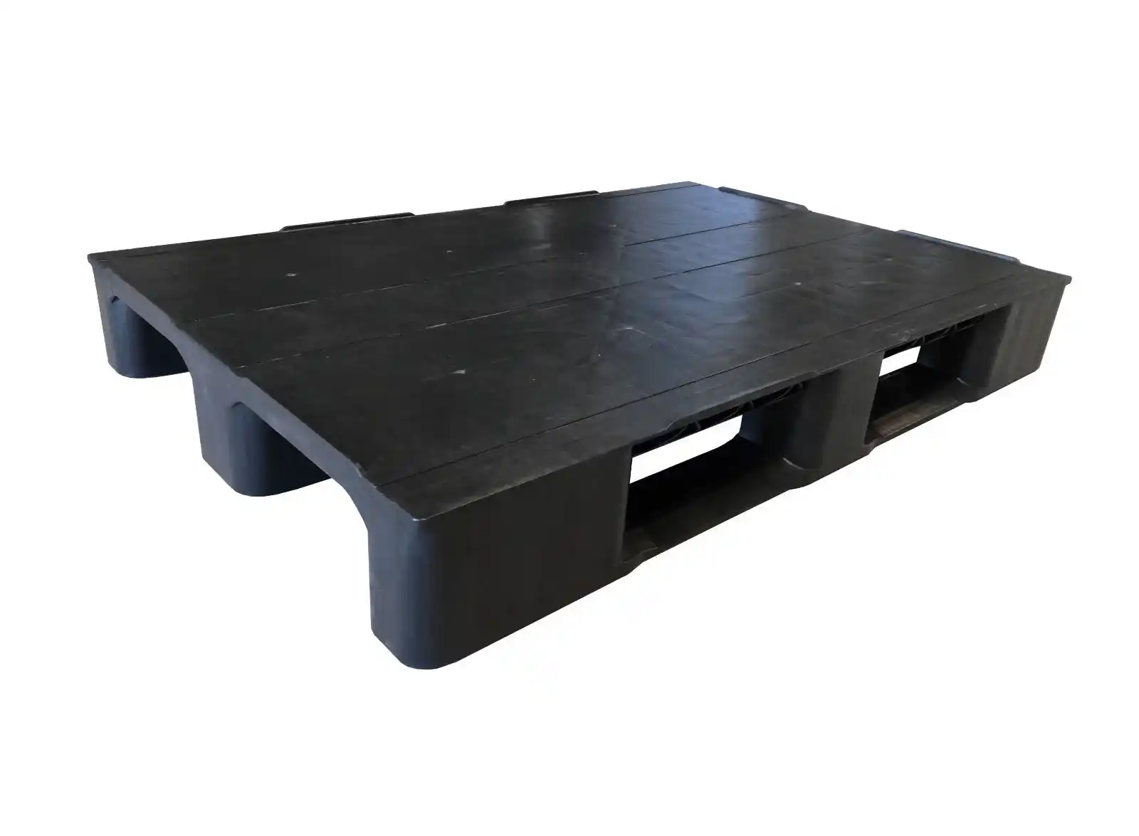 Palet de plástico de 1200×800 mm. base lisa con 2/3 patines y 14 kilos de peso. Carga 4.500 kilos en estática y 750 kilos en estantería.
