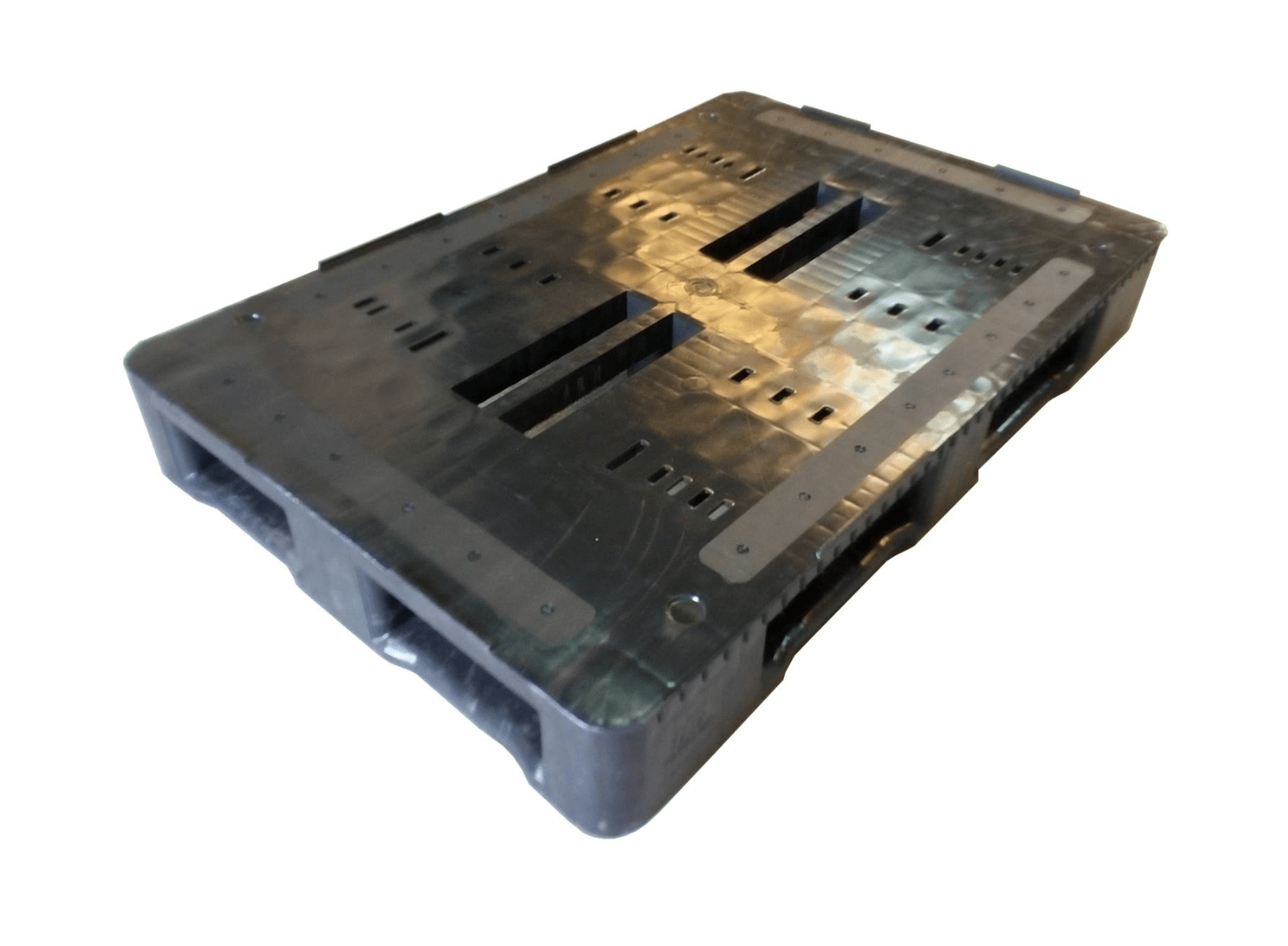 Palet de plástico robusto de 1200×800 mm con tres patines y 17,5 kilos de peso. Carga en estática 4.000 kilos y 850 kilos en estantería.