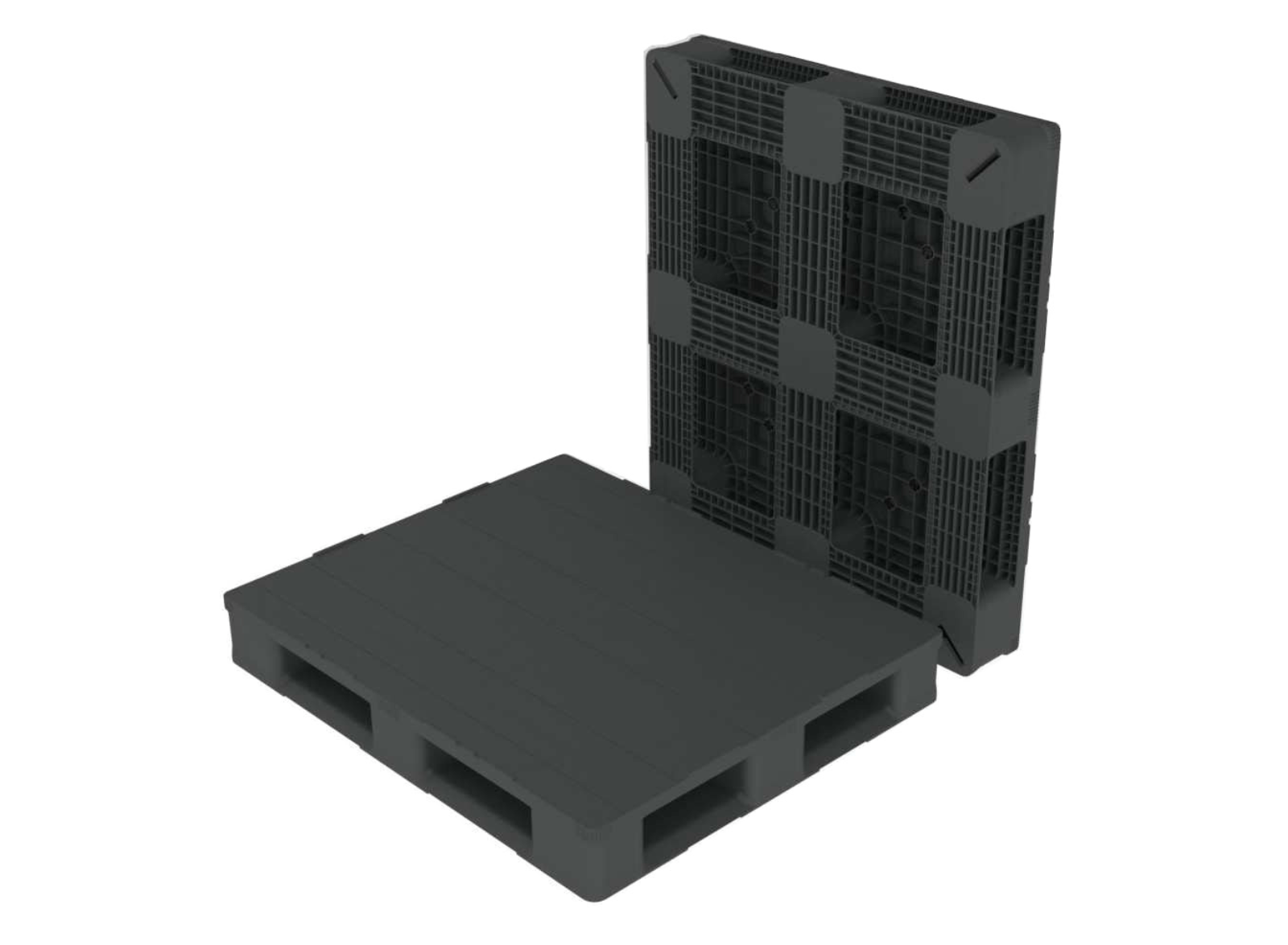 Palet de plástico de 1200×1000 mm base lisa con 6 patines. Palet pesado de 26,3 kilos, carga en estática de 7.000 kilos y 1.200 kilos en estantería.