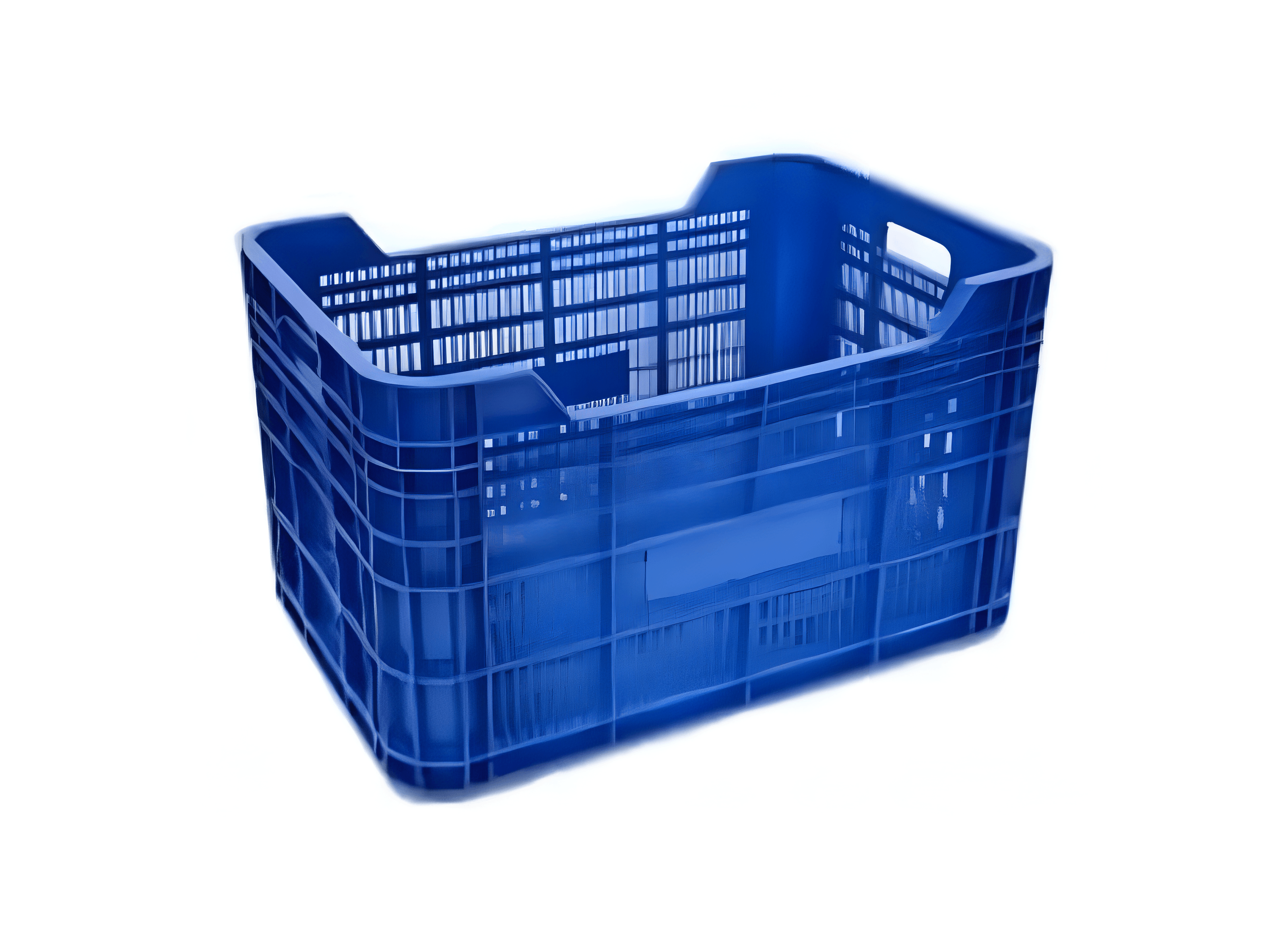 Caja agrícola de plástico, apilable y retornable de 600x400x345 m. Paredes y fondo rejillado de 2.750 g. de peso. 100% reciclable.