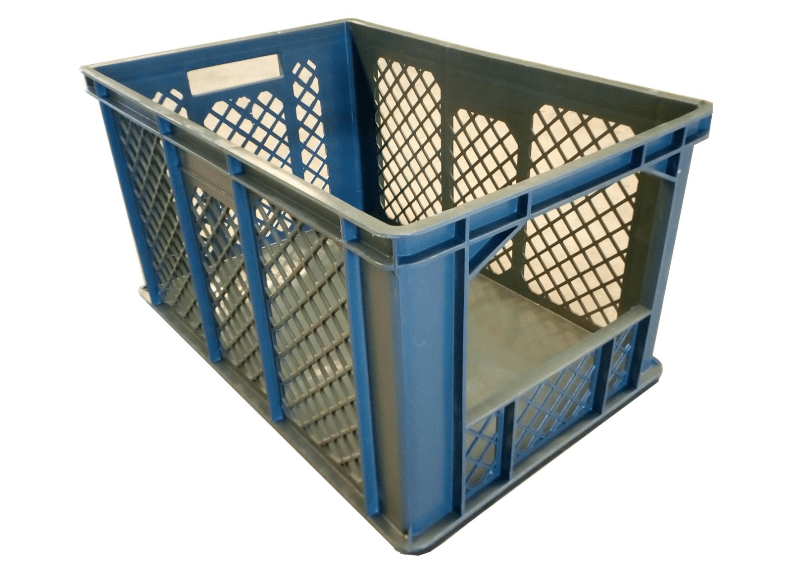 Caja de plástico apilable de medida 600x400x320 mm Paredes perforadas y fondo liso. Con abertura en lado corto, de 63 litros de capacidad y 2.380 g. de peso.