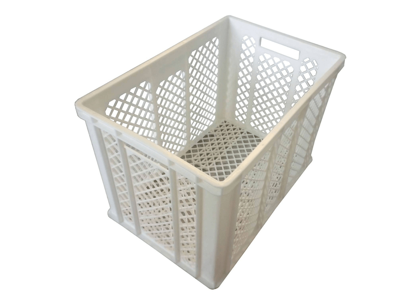 Caja de plástico apilable de medida 600x400x410 mm Paredes y fondo perforado de 82 litros de capacidad y 2.720 g. de peso.