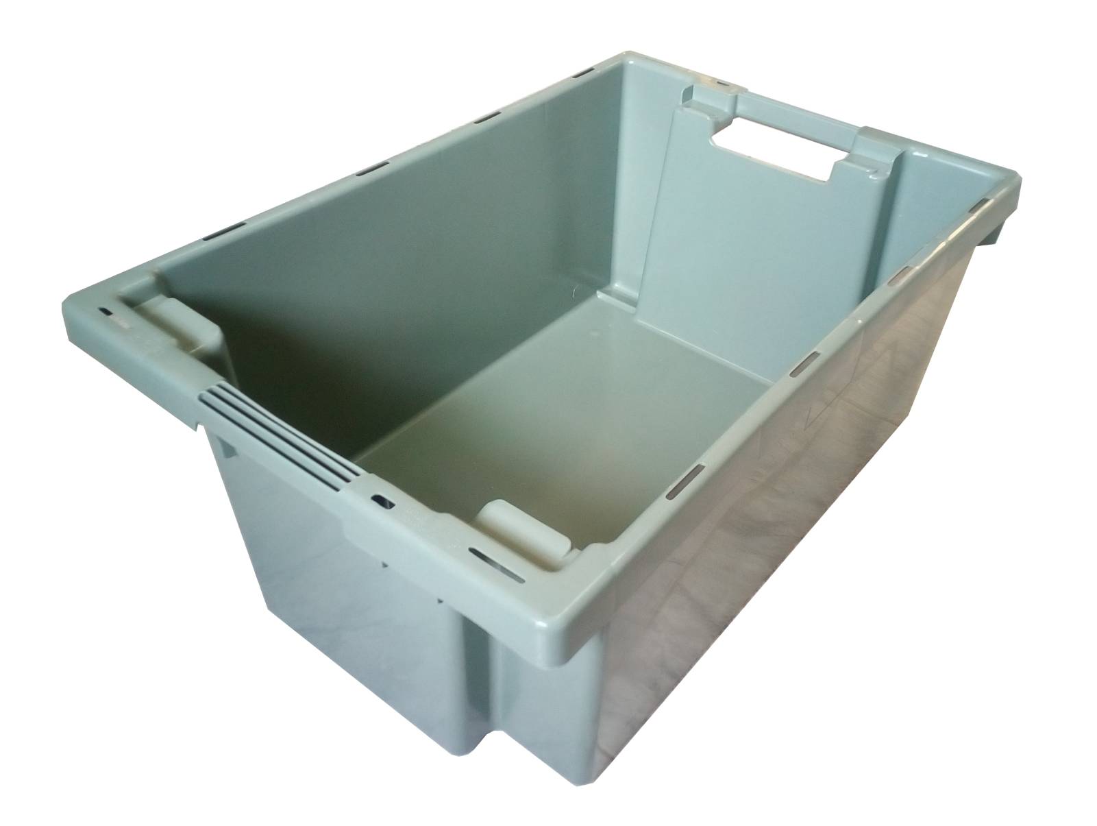 Caja de plástico apilable y encajable de medida 600x400x250 mm. Paredes y fondo liso, de 45 litros de capacidad y 1.920 gramos de peso.