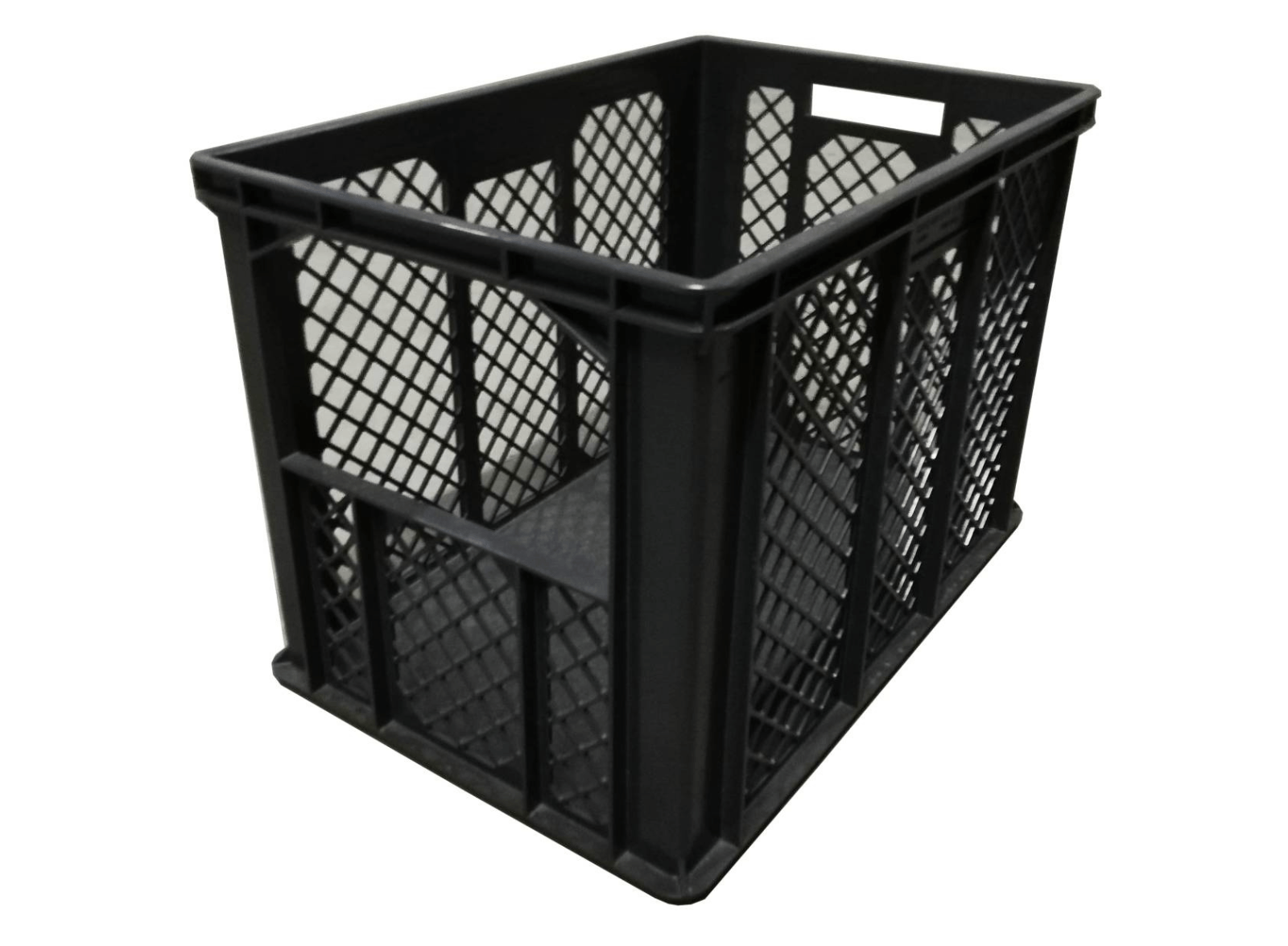 Caja de plástico apilable de medida 600x400x410 mm Paredes perforadas y fondo liso, con abertura en lado corto y 82 litros de capacidad.
