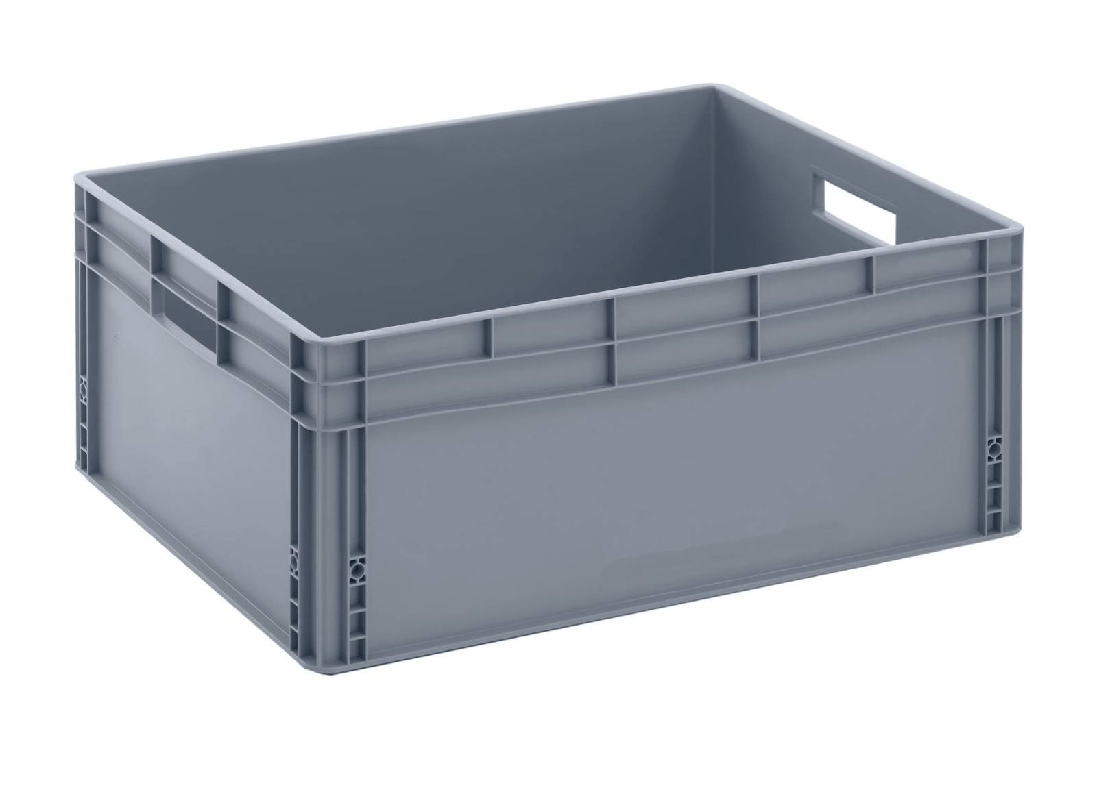 Eurocontenedor de plástico liso de medida 800x600x220 mm. de asas abiertas y de 130 litros de capacidad y 4.900 g. de peso. Fabricado con polipropileno de uso alimentario.