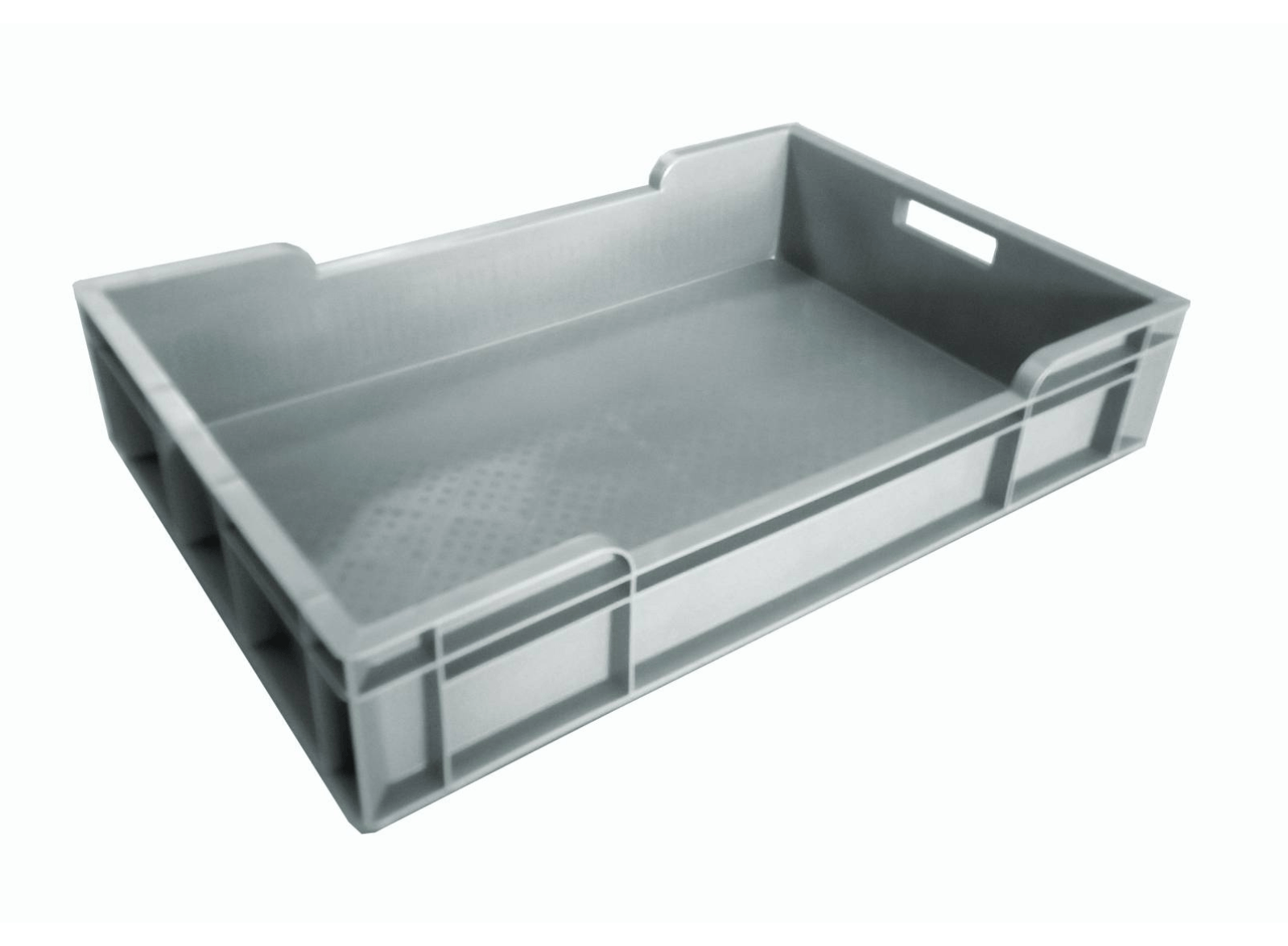 Caja de plástico cerrada de medida 600x400x120 m. Apilable de 20 litros de capacidad y 1.250 g. de peso. Hecha con HDPE apto para uso alimentario.