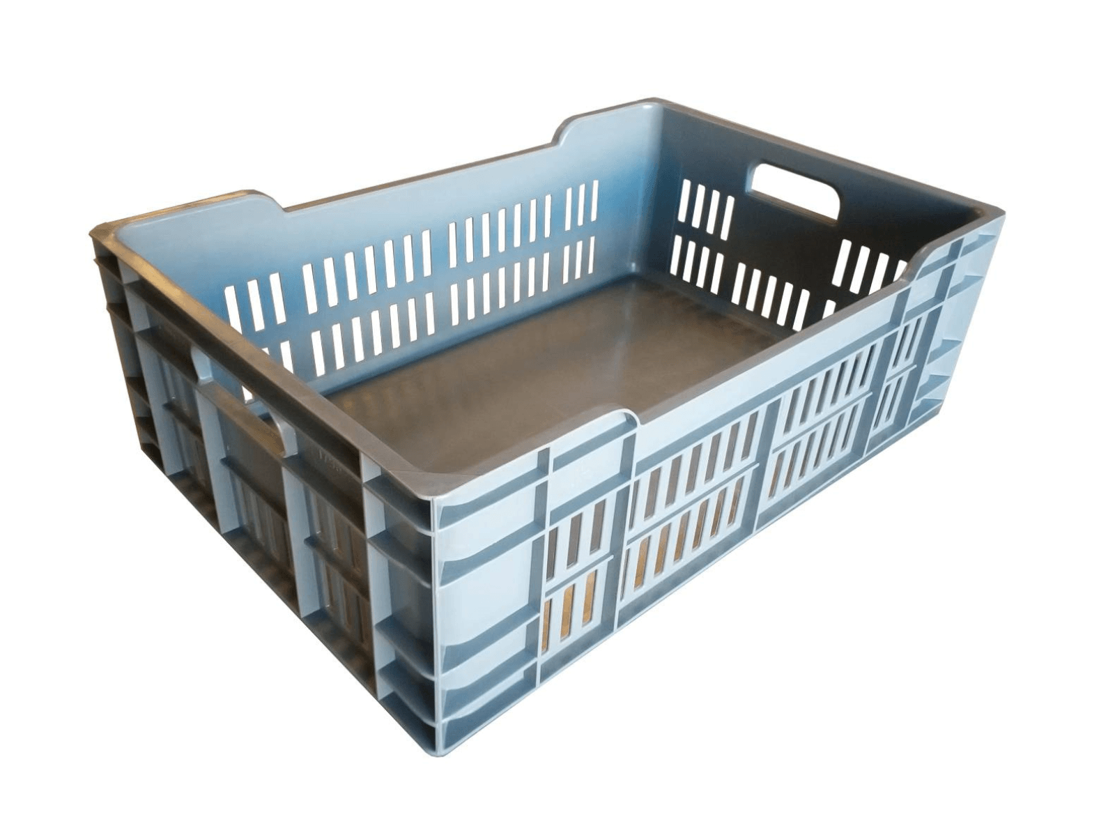 Caja de plástico apilable de medida 600x400x200 mm. Paredes rejilladas y fondo liso, de 40 litros de capacidad y 2.000 g. de peso. Fabricada con polietileno.