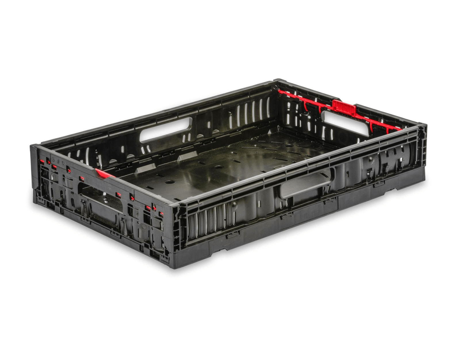 Caja plegable de plástico, perforada de medida 600x400x118 mm. de 23 litros de capacidad y 1.463 g. de peso. Altura plegada 28 mm.